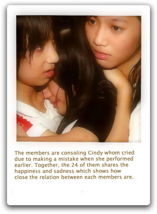 The other members admitted that they never saw Cindy gloomy or sad since she always smiles. Except when she fell at the rehearsal for her first concert in Jakarta, she cried at that time which shocked the other members and makes them very worried.
